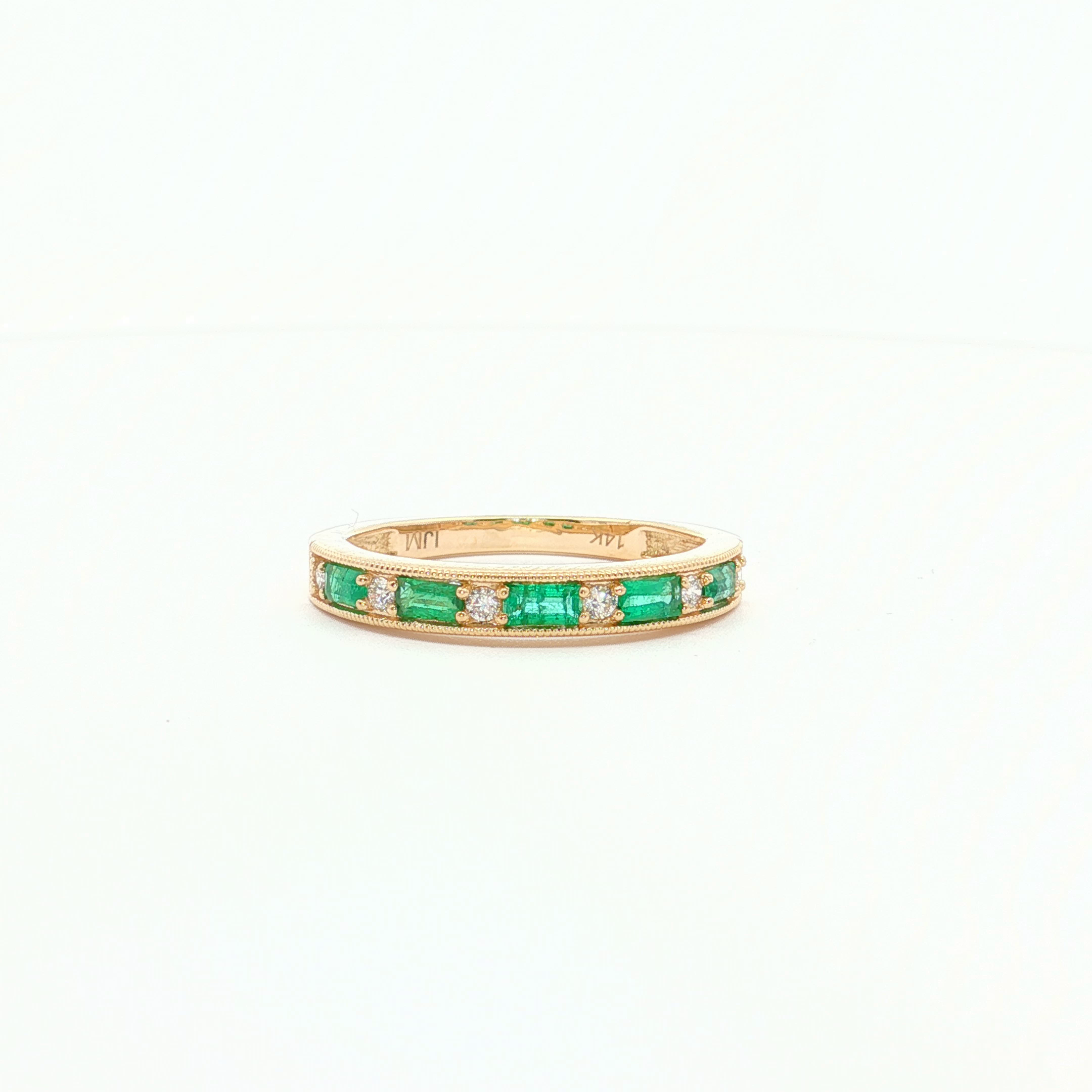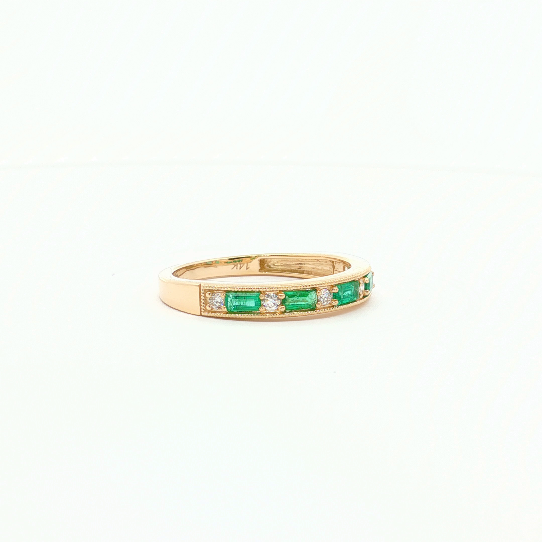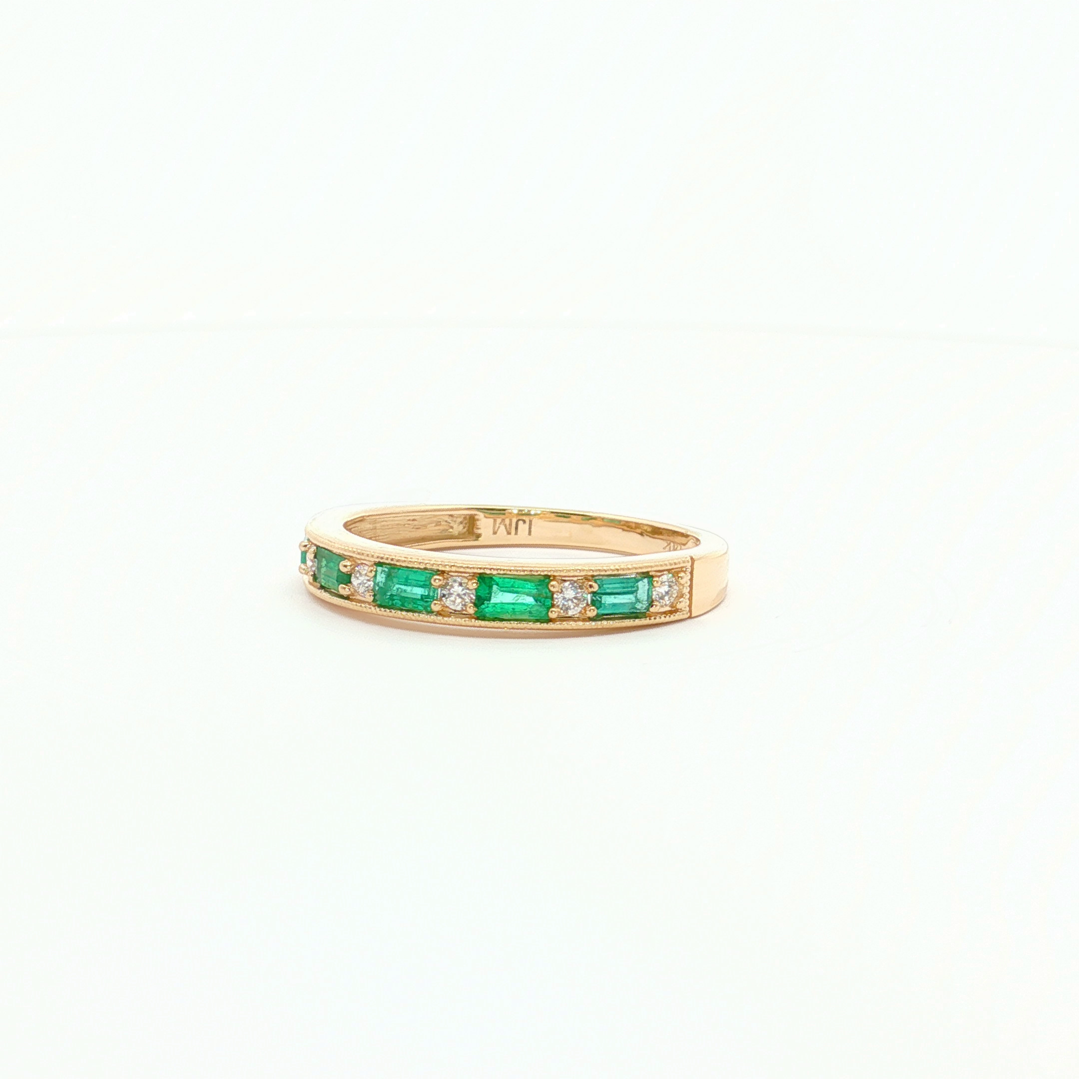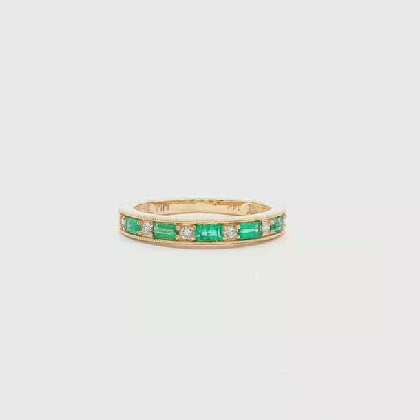 Elegantly crafted, this yellow gold eternity ring features vibrant green emerald gemstones, precisely step cut into classic emerald shapes. This sophisticated band offers a timeless design with exceptional clarity. Its radiant polish and symmetrical arrangement accentuate the natural beauty of the emerald, creating a stunning piece that symbolizes everlasting commitment and style.