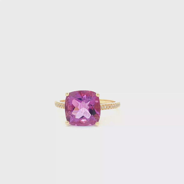 Elevate your style with this captivating cocktail ring, featuring a cushion-cut amethyst gemstone. Set in a radiant yellow gold base, the amethyst boasts a vibrant purple hue and mixed cutting style. This exquisite ring is a statement of sophistication and unique taste, perfect for adding a touch of elegance to any ensemble.