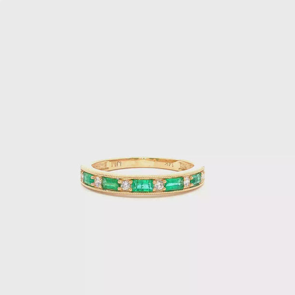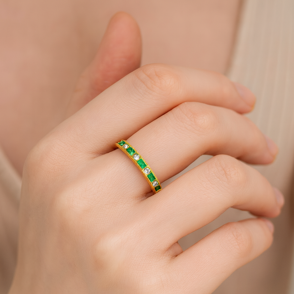 Exquisitely crafted, this yellow gold eternity ring features a series of expertly step-cut emeralds. The lush green gemstones are set in a continuous band, symbolizing enduring love and commitment. This classic design, known for its refined elegance, offers a sophisticated touch to any jewelry collection.
