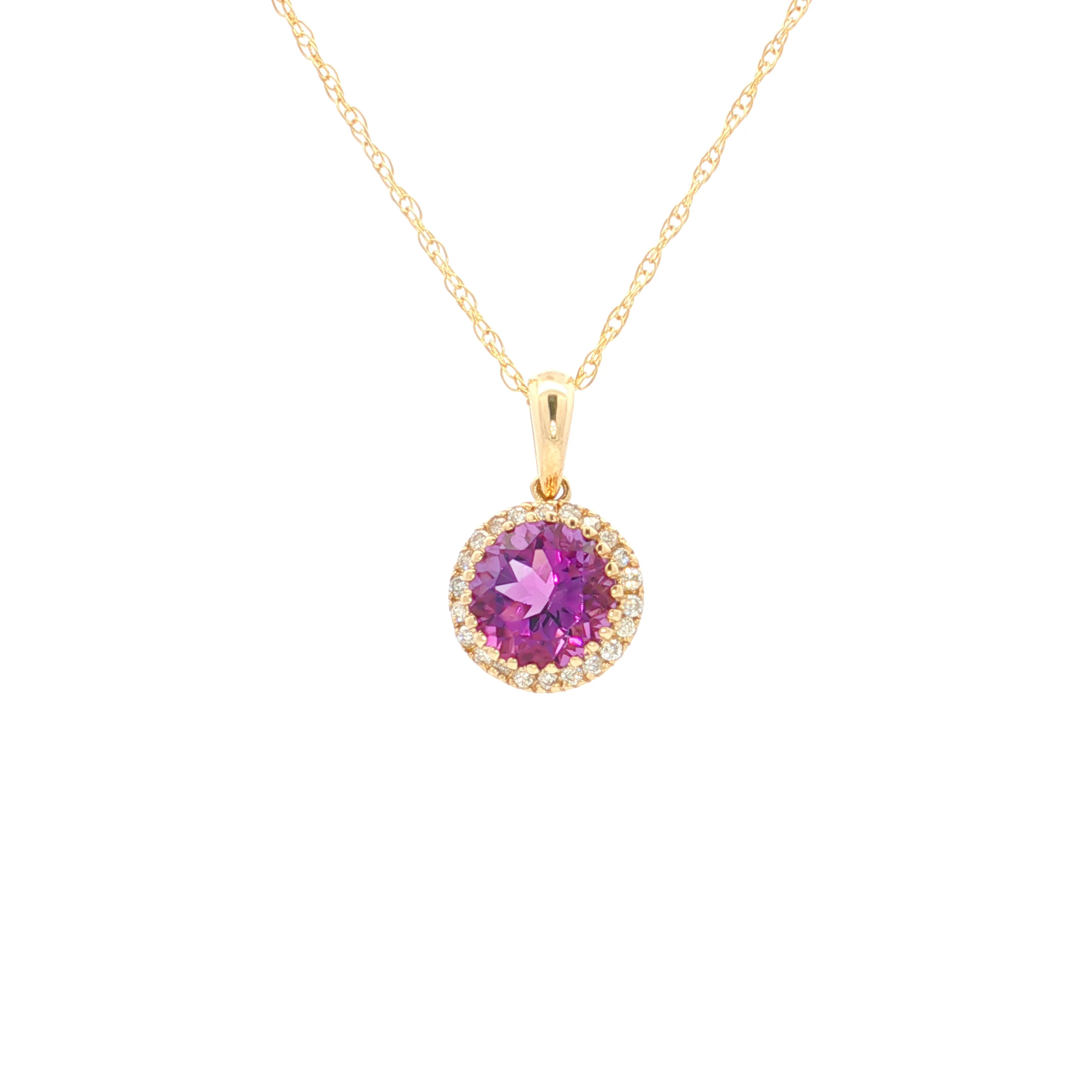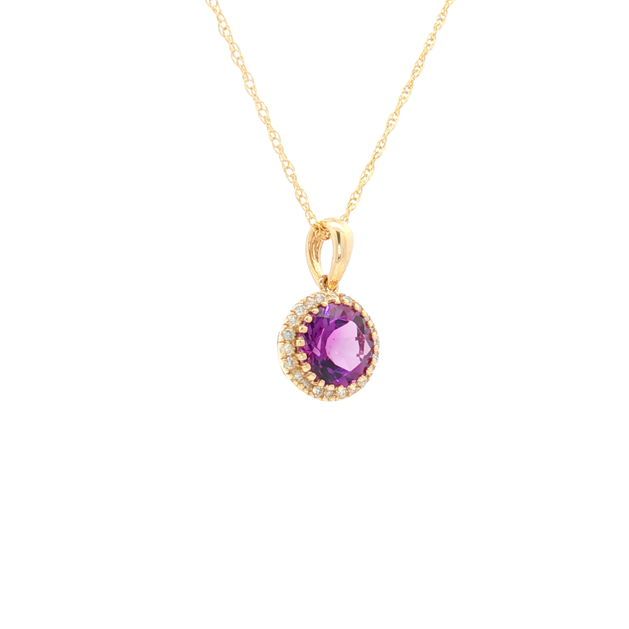 Elevate your style with this charming necklace, featuring a radiant round-cut amethyst gemstone set in a lustrous yellow gold. The brilliant faceting of the purple amethyst enhances its natural vibrancy, creating a captivating focal point. This pendant exudes sophistication and charm, perfect for adding a touch of refined elegance to any ensemble.