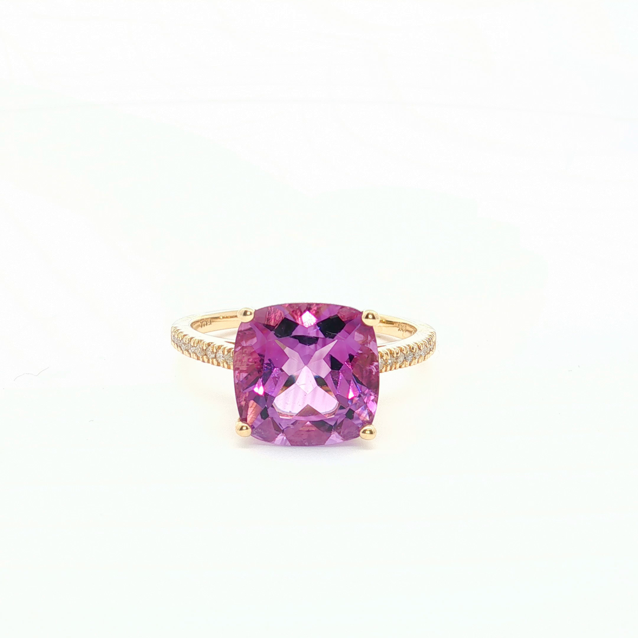Indulge in the captivating allure of this striking cocktail ring. The yellow gold band gracefully supports a stunning cushion cut amethyst, showcasing a mesmerizing reddish purple hue. Its mixed cut enhances the gem's brilliance, promising a captivating sparkle. Perfect for adding a touch of regal elegance to any ensemble.