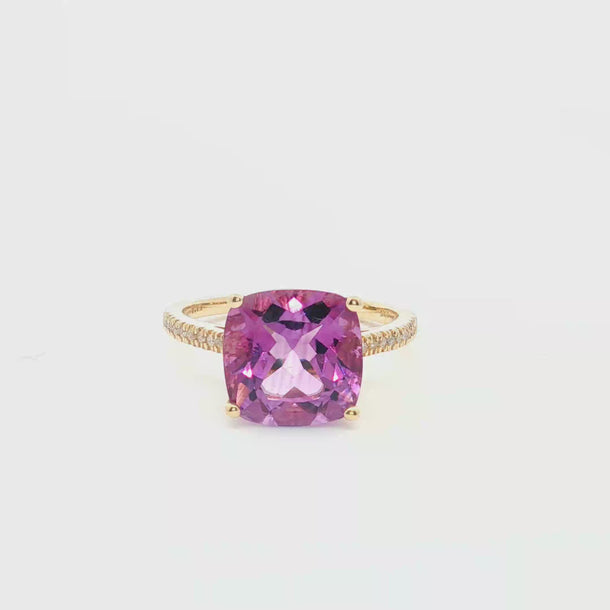 Yellow Gold Cocktail Ring with Reddish Purple Cushion Cut Amethyst