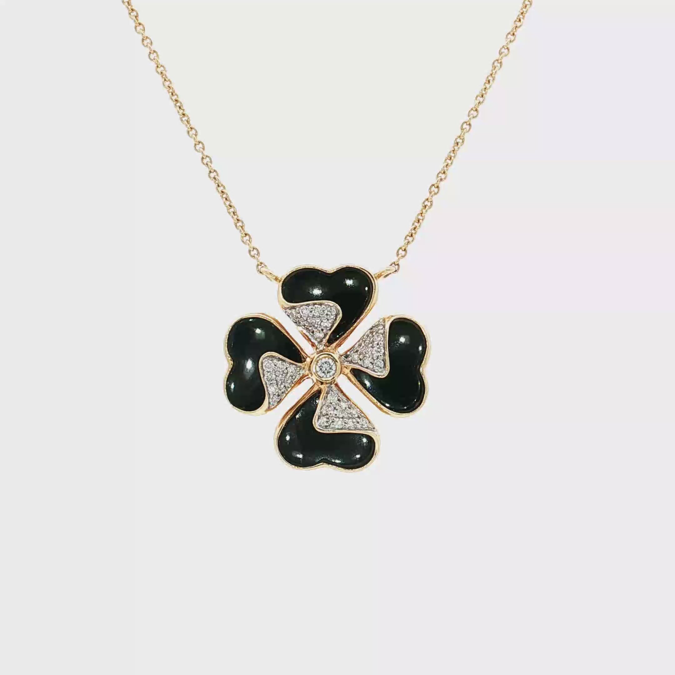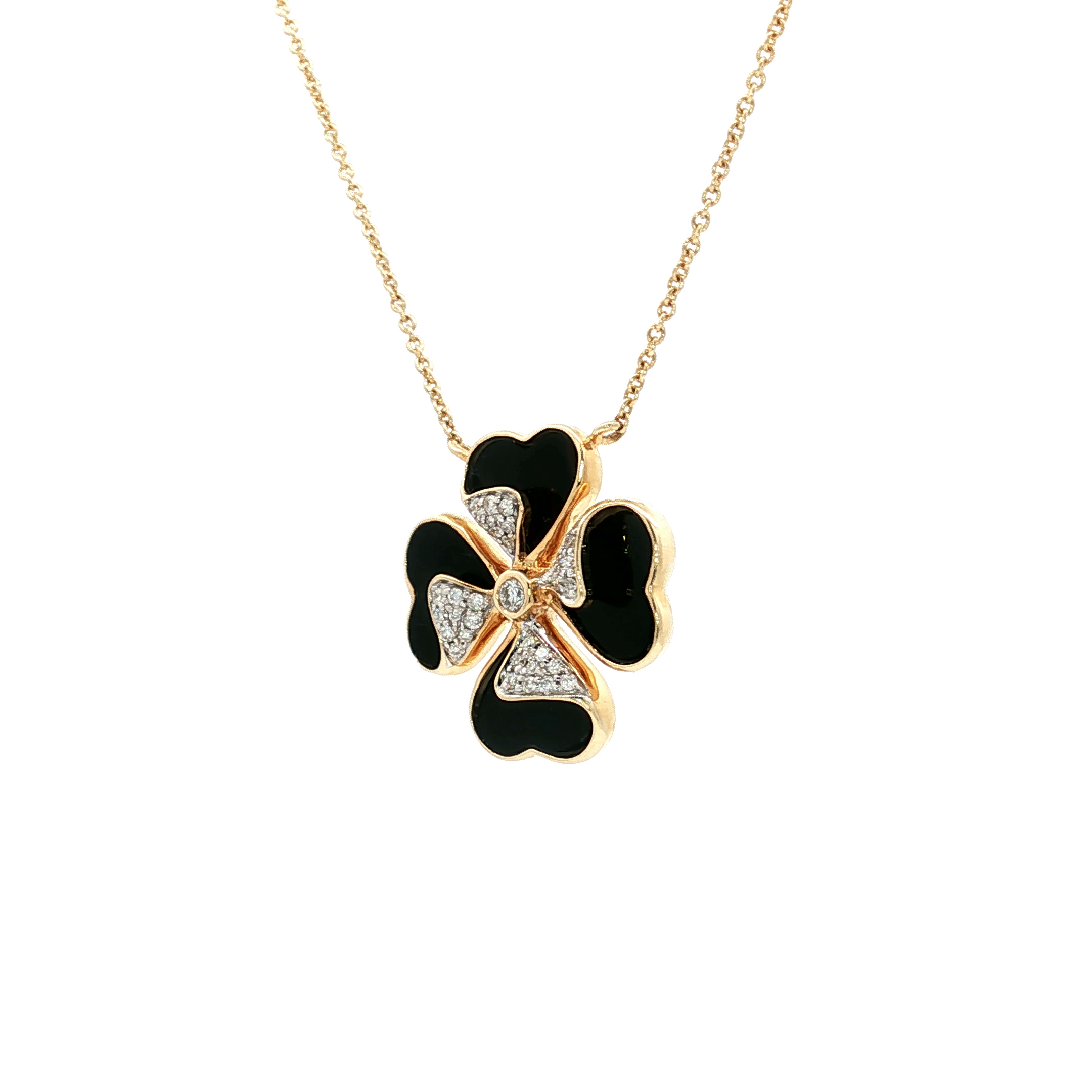Yellow Gold Four-Leaf Clover Charm Necklace with Round Brilliant Diamond 0.15 14K 2.57 Onyx