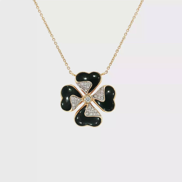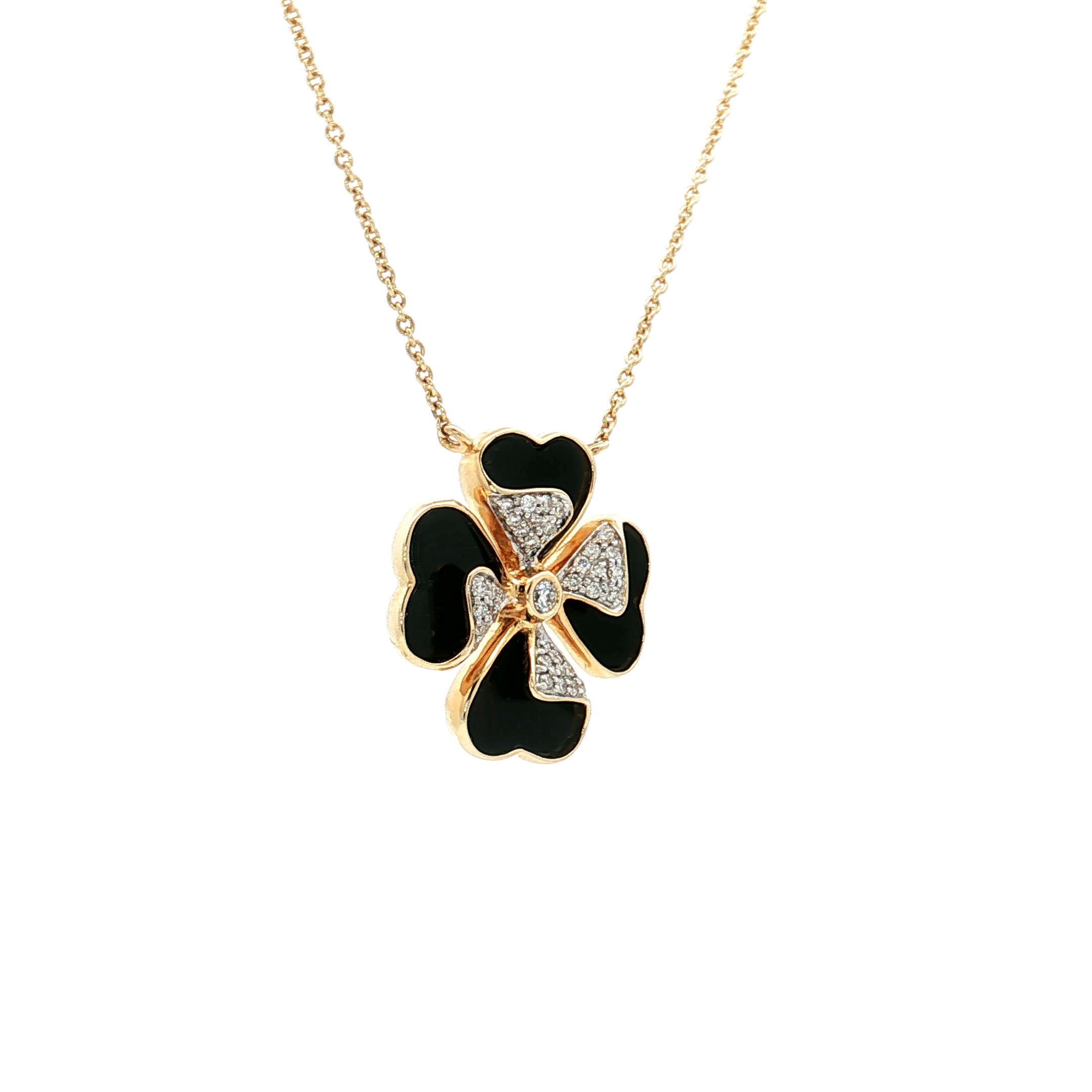 Elevate your style with this exquisite yellow gold charm necklace. Featuring a delicate four-leaf clover design, the pendant showcases contrasting black enamel petals complemented by a central round brilliant-cut diamond. A classic yet modern piece, perfect for adding a touch of elegance to any ensemble.