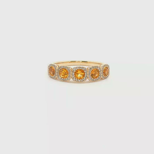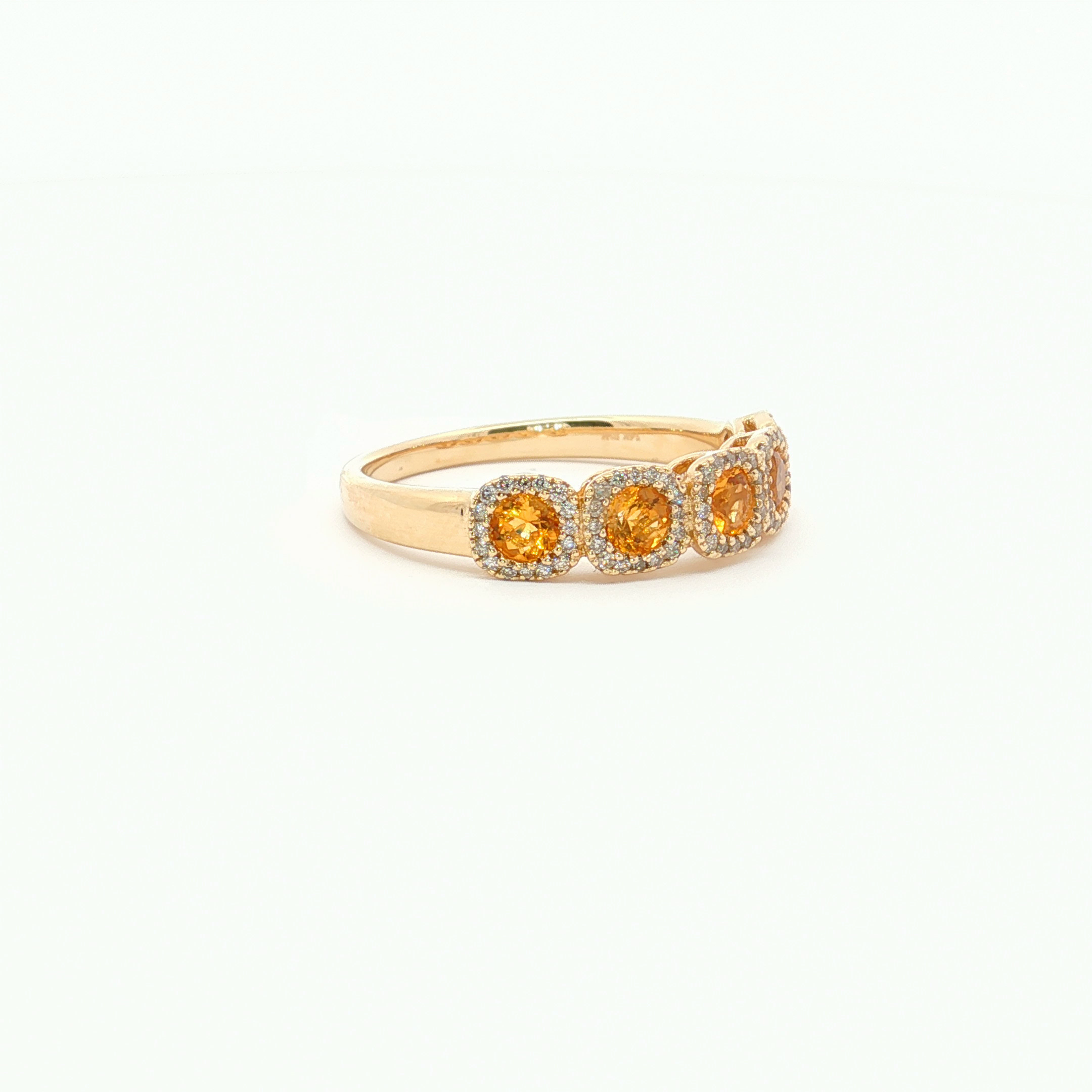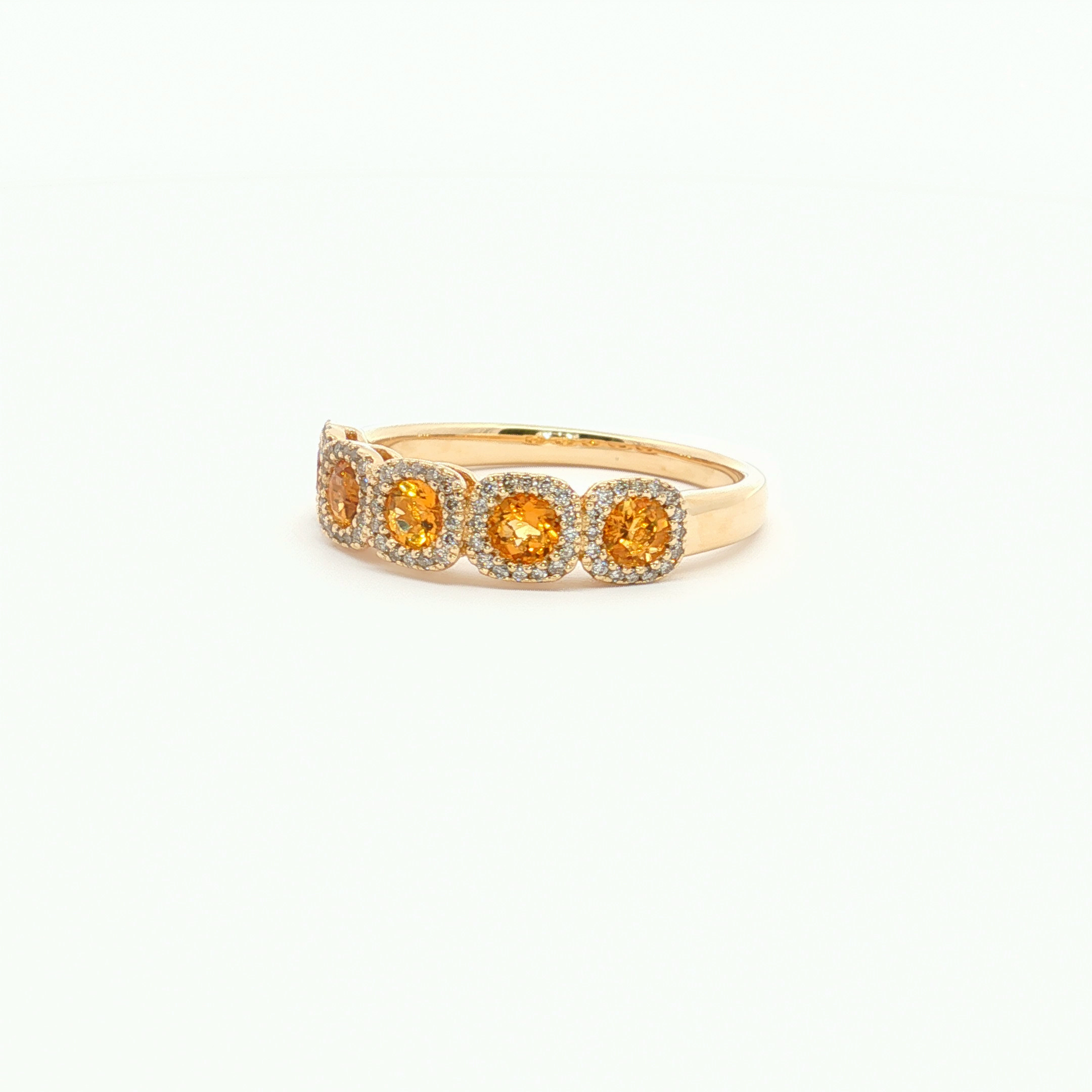 Radiant and refined, this multistone ring features round cut brilliant citrines, each displaying a vibrant orangy yellow hue. Set in a warm yellow gold, the meticulous design showcases the gemstones in a horizontally placed arrangement, creating a piece of jewelry that exudes both modern sophistication and timeless elegance.