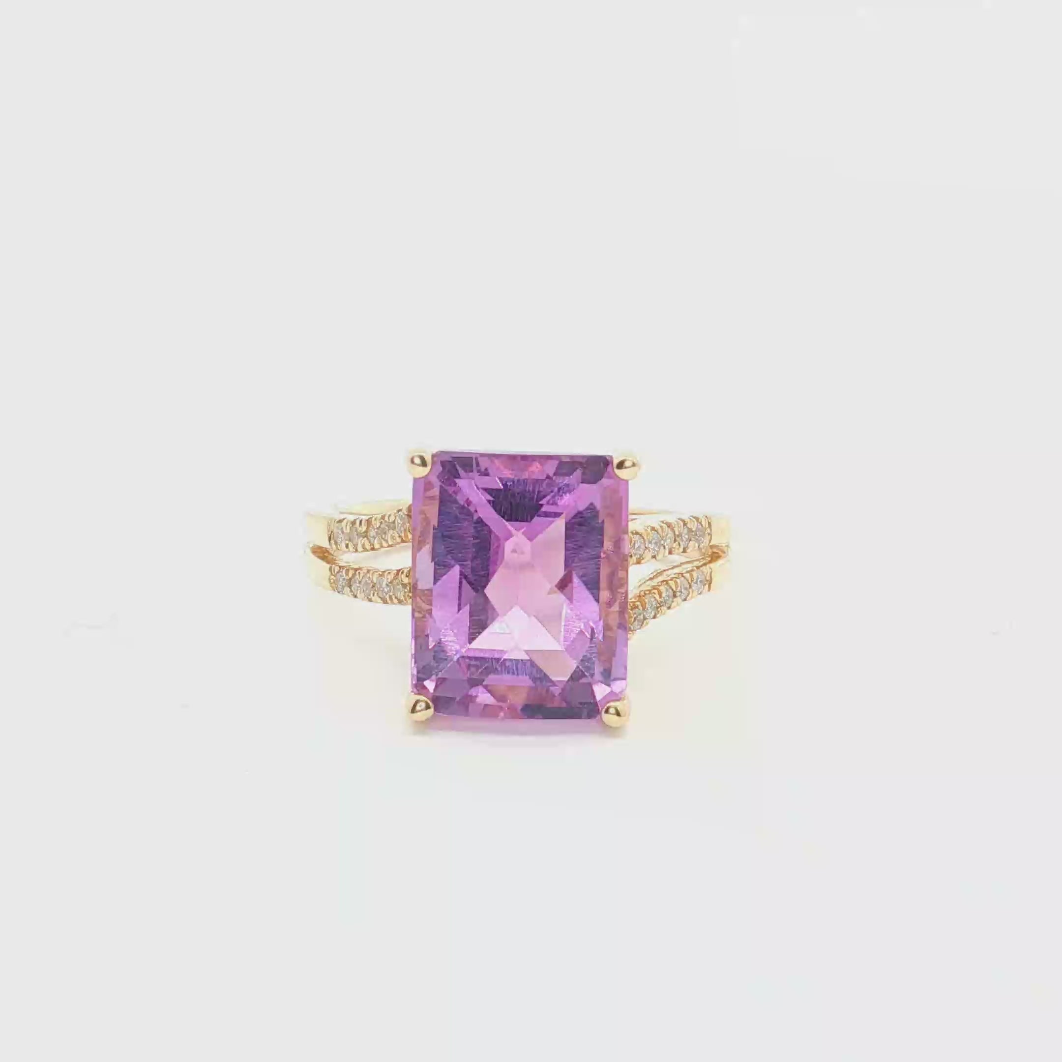 Elevate your style with this exquisite yellow gold ring, showcasing a captivating amethyst gemstone. The step-cut design of the purple hued amethyst amplifies its brilliance. A statement piece that exudes sophistication and charm, this ring is perfect for adding a touch of luxury to any ensemble.